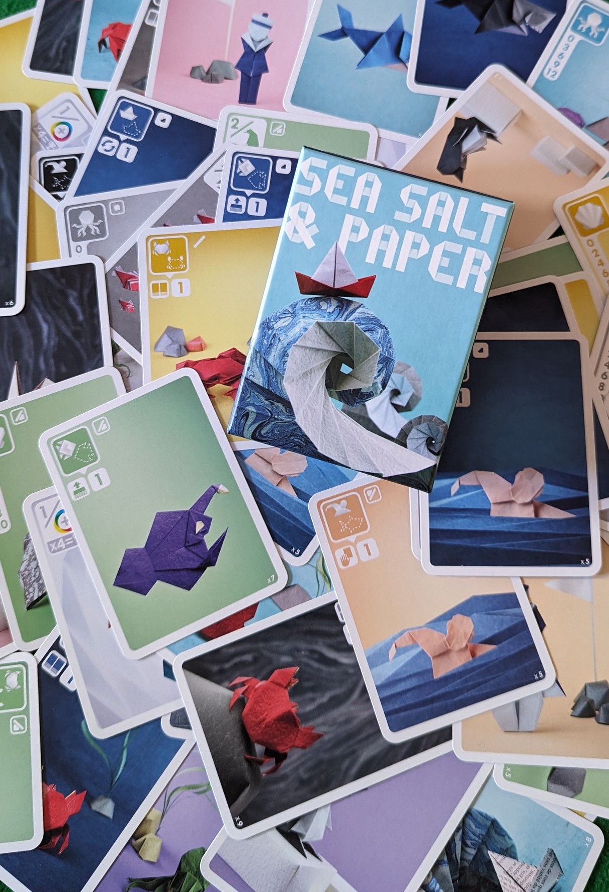 Sea Salt and Paper was an instant hit for me. It’s a great game with gorgeous art work – each card has a unique origami image on it and the symbols in the corner make it clear which type of card it is. So, although each boat is slightly different they are clearly all boats. It also has really clear symbols for people who are colour blind.