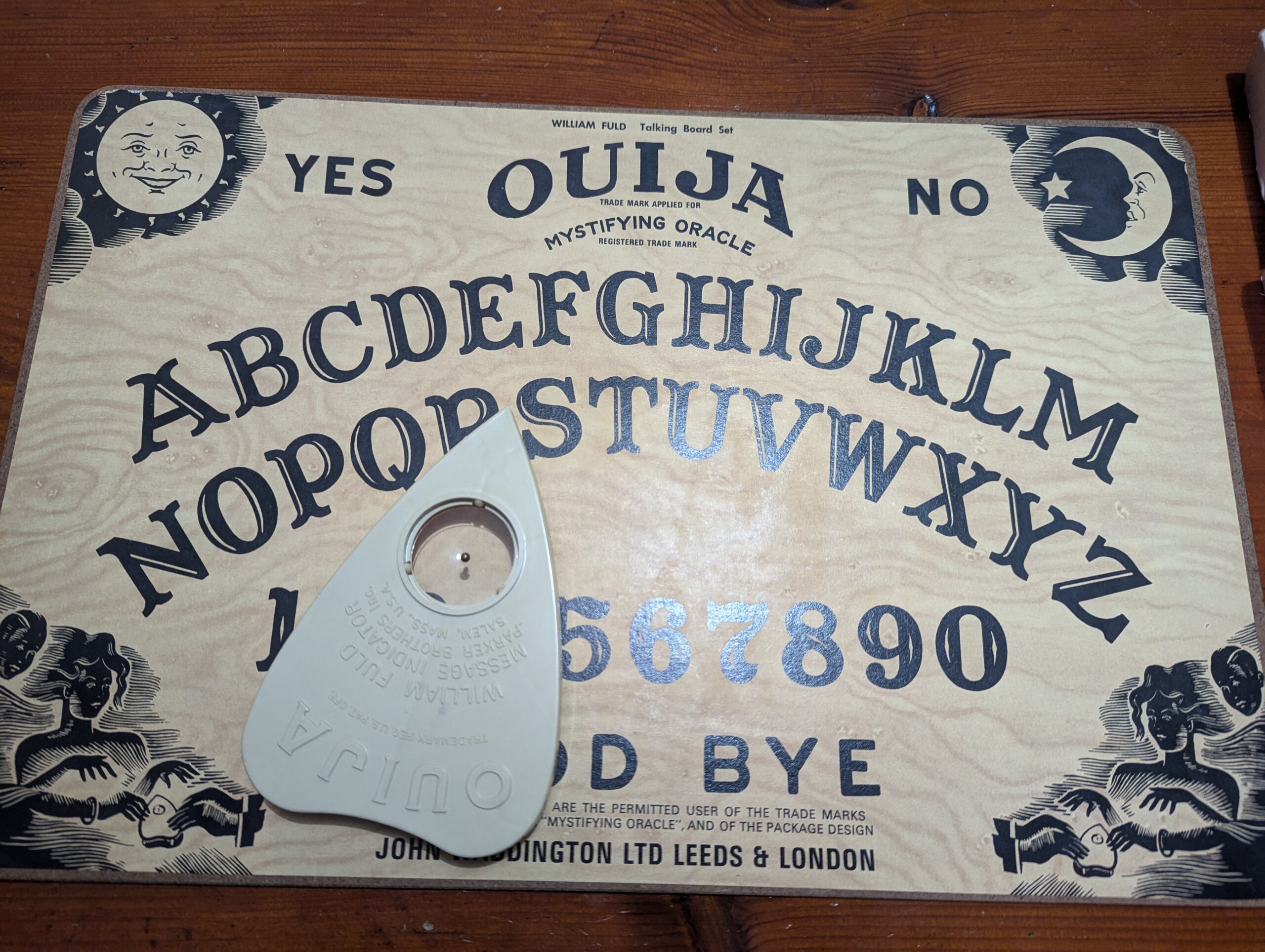 Parker Bros popularised the board in the 60s and of course licensed it to their good buddies Waddingtons right here in Leeds and I held out on buying one until I could get a Waddington’s version (even though it is basically the same). The Ouija itself had been around since the late 1800s and spirit talking boards were around for 100s of years before that but it was Parker Bros that cracked the mass market.